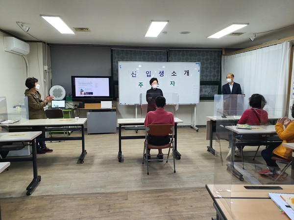 새로 중학반에 입학하신 주순자 학생입니다 뒤늦은 공부지만 남다른 열정으로 임하시는 다짐을 학생들에게 이야기하셔서 큰 박수를 받으셨습니다
