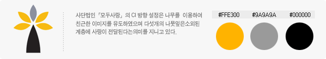 사단법인 "모두사랑"의 CI 방향 설정은 두개의 이미지 원은 이웃과 함께 나눔을 뜻하며, 나무를 이용하여 친근한 이미지를 유도하고, 다섯개의 나뭇잎은 소외된 계층에 사랑을 전달하는 의미를 지니고 있다.